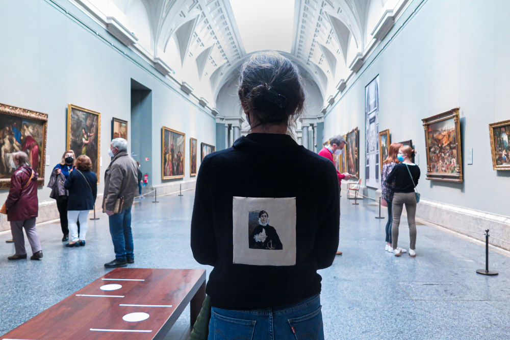 La acción cuestiona el orden patriarcal implícito en las colecciones de arte, introduciendo un elemento disruptivo en el recorrido de los turistas por el museo: los dos bordados y el cuerpo de la artista como soporte de la obra de arte, una de las claves de arte feminista de los años 70, que María Gimeno retoma en su “infiltración”.