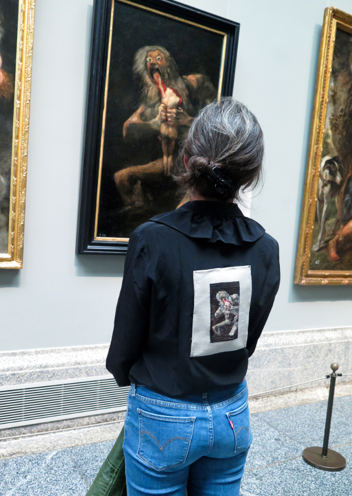“Urdimos un plan. Primero el trabajo de campo: visita con el director del museo más pobre del mundo [M]UMoCA a la pinacoteca. Analizamos qué obras interesan, dónde está ubicadas y cómo están vigiladas. El día de la acción somos cuatro mujeres, cada una tenemos nuestro papel. Una viste las obras, otra las fotografía y dos dan el agua. En el museo está prohibido hacer fotos. Quedamos en un café, les muestro los planos del museo y el recorrido planeado. Primero el Greco y después Goya. Entre ambos, improvisamos con las grandes obras de la colección. Durero, Anguissola, Velázquez, Gentileschi. El recorrido se realiza como estaba planeado. Las aguadoras entretienen a los vigilantes y hacen de barrera visual para que la fotógrafa haga su trabajo. La Caballera va en la capa exterior, esconde a Saturno, ambas piezas se van alternando dependiendo del cuadro frente al que esté situada. Todas disimulamos. Cuento historias a mis tres compañeras sobre las obras mientras escucho atenta las instrucciones de la fotógrafa: –Más a la derecha. Gírate ligeramente. Aguanta. Espera. Ahora. Ya está.”