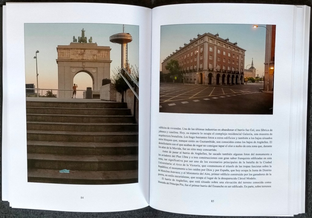 No voy a entrar en más detalles de la pieza, de la que ya hablé hace pocos meses (https://antimuseo.org/2021/02/04/arte-inconfinado), sino sobre este volumen, con sus textos, fotografías y planos, editado con el apoyo del Fondo Asistencial de VEGAP y la colaboración de Ars Activus ediciones. Es un libro grande, más de 200 páginas en DIN A4. Está dividido en treinta capítulos, cuyos títulos sitúan cada recorrido en su zona. Salvo el primero, Aires de pesadilla. Las fotografías van siempre a media página o a página entera y, como ya he dicho, son buenas y nos muestran un Madrid perfectamente cotidiano e insólito a la vez. Al final hay un plano general con todos los recorridos, circular, y los planos particulares de cada itinerario.