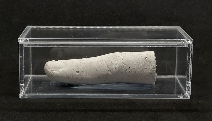 Descripción: fragmento de una de las piezas que forman parte de la instalación R de resistencia o la vergüenza de ser hombre. Procede del primer vaciado de escayola para la elaboración de los moldes. Dañada durante el proceso de fraguado. Representa un dedo, probablemente el índice de la mano derecha.
