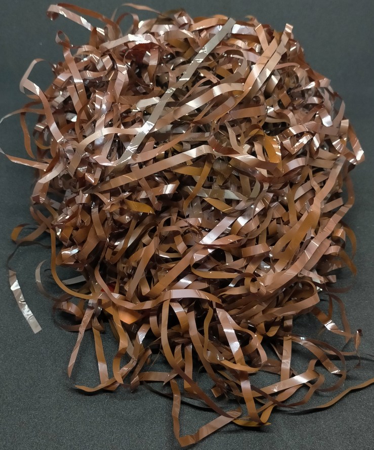 Descripción: restos de cinta magnética desechados en la edición de obras sonoras. Proceden de cassettes recuperados, muchos son secciones en silencio al final de las grabaciones, otros son zonas dañadas que se retiraron antes de su regrabación. En total corresponden aproximadamente a dos horas de grabación. En palabras del artista, representan «minutos inservibles».