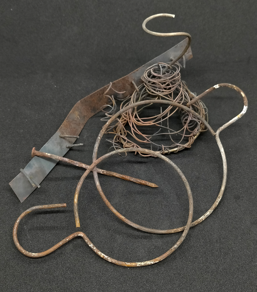 Descripción: grupo de elementos metálicos provenientes de la instalación Procesos resultantes de revisión, selección y traslado de taller, realizada en Cruce arte y pensamiento contemporáneo. Los elementos están oxidados. Consisten en: dos alambres retorcidos de distinto calibre que forman un cono, otro con forma de muelle, un clavo, dos aros rematados con sendos ganchos y una tira de chapa con cuatro grapas.