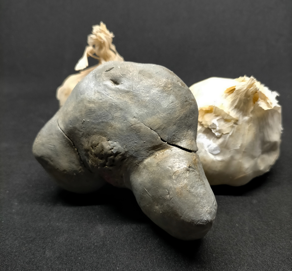 Descripción: elemento desechado de la pieza La ristra de Courbet, dentro del proyecto Las tentaciones de Courbet. Consiste en un modelado en plastilina de unas caderas femeninas desnudas, que envuelven parcialmente una cabeza de ajo seco. Presenta varias grietas y mantiene un suave olor a ajo. Está firmado en la nalga izquierda. Incluye otros dos ajos secos que fueron utilizados como moldes.