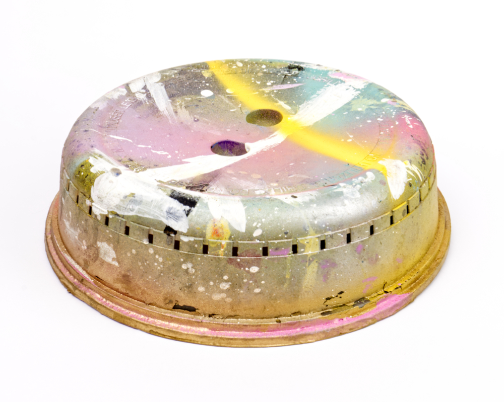 Tapa para microondas utilizada como máscara para dibujar círculos y circunferencias en la serie de pinturas sobre lienzo Planetas y micromundos. Fecha: 2019. Medidas: Ø 270 mm. x 69 mm. Materiales: plástico, pintura acrílica y aerosol. https://www.instagram.com/anacedrona/