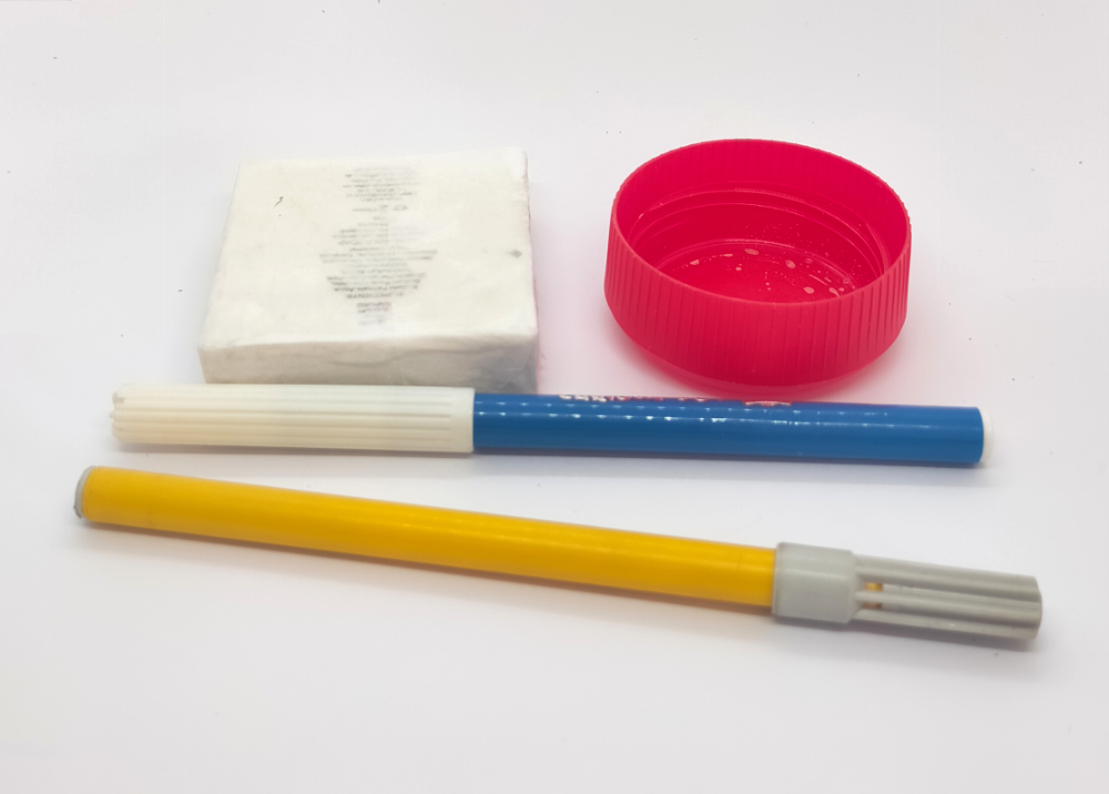 Conjunto de útiles de dibujo. Incluye dos rotuladores gastados (azul y amarillo), un tapón de plástico de color rojo y una caja de jabón tamaño amenitie forrada con papel manila.