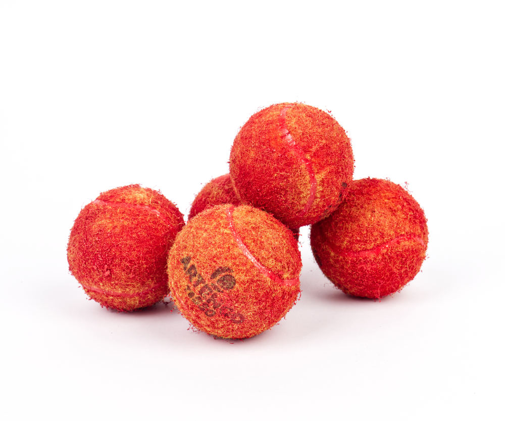Conjunto de cinco pelotas de tenis pintadas de rojo. Se exhibe un grupo de tres. Fueron utilizadas en la performance Aleatoria. Fecha: 2021. Medidas: Ø 65 mm cada una; caja: 120 x 120 x 110 mm. Materiales: caucho, gas presurizado, fieltro sintético, pintura roja. https://www.elisamiravalles.com/aleatoria-2020