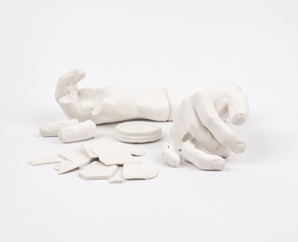 Dos manos a escala reducida, con cuatro dedos rotos (se incluyen) y restos de escayola que quedaron pegados al vaso de mezcla. Pertenecen a la primera versión de la pieza Bondage japanese businessman, que fue desechada para realizarse posteriormente a escala natural. Fecha: 2019-2020. Medidas variables; caja: 166 x 136 x 110 mm. Materiales: escayola https://www.instagram.com/esthergarciaurquijo