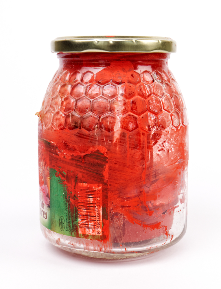 Tarro de vidrio utilizado en la preparación de la performance Rojo pasión de Bruguer sobre patata.