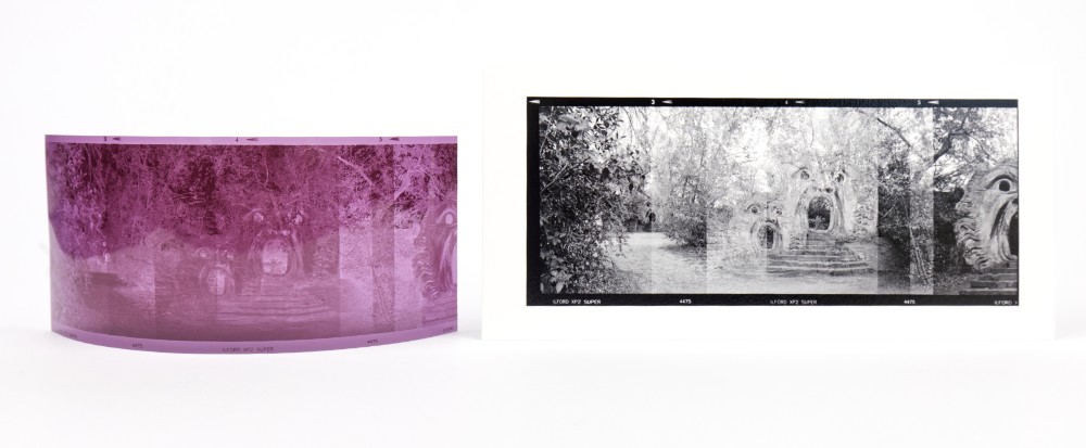 Negativo y prueba digital de una fotografía descartada debido a una exposición múltiple accidental, por avería en la cámara. Perteneciente a la serie Memorabilia. Fecha: 2019 Medidas: papel 175 x 85 mm. negativo 149 x 60 mm. Materiales: negativo fotográfico, papel, tinta. https://josequintanilla.com/?project=la-casa-quemada