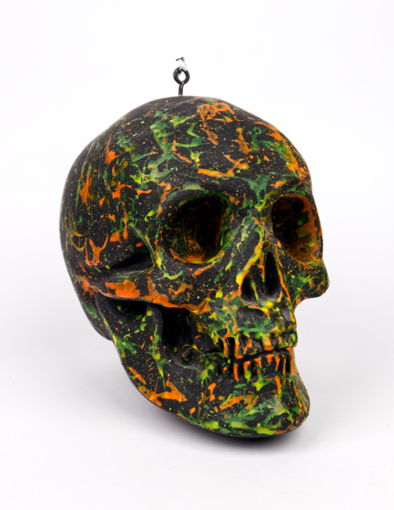 Cráneo correspondiente al personaje Yorick, de Hamlet, utilizado en la instalación Oniric Landscapes, en participación a la propuesta colectiva Bellas Durmientes de María María Acha-Kutscher. El cráneo está pintado de negro, con un dripping de laca fluorescente. Tiene una hembrilla en la parte superior, con un resto de hilo de nylon atado a ella: Fecha: 2009. Medidas: 200 x 130 x 195 mm. Materiales: escayola, esmalte sintético, laca fluorescente, acero, nylon.