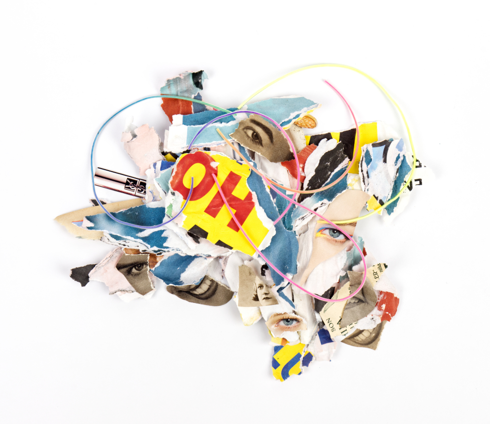 Restos de papel procedentes de un trabajo de décollage (raspados) en carteles pegados en la vía pública. Incluye unos cordones de colores encapsulados en plástico. Fecha: 2023. Medidas variables; caja: Caja 130 x 130 x 30 mm. https://www.instagram.com/losuper.collage/