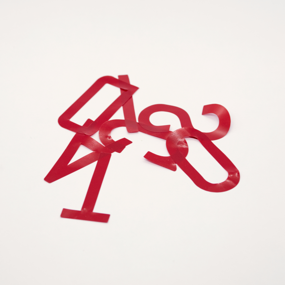 Letras de vinilo para la exposición de la Galería Domicilio, en la Ciudad de México, en abril de 2024. Fueron impresas invertidas, en modo espejo, para su colocación sobre vidrio por error, por lo que se desecharon.