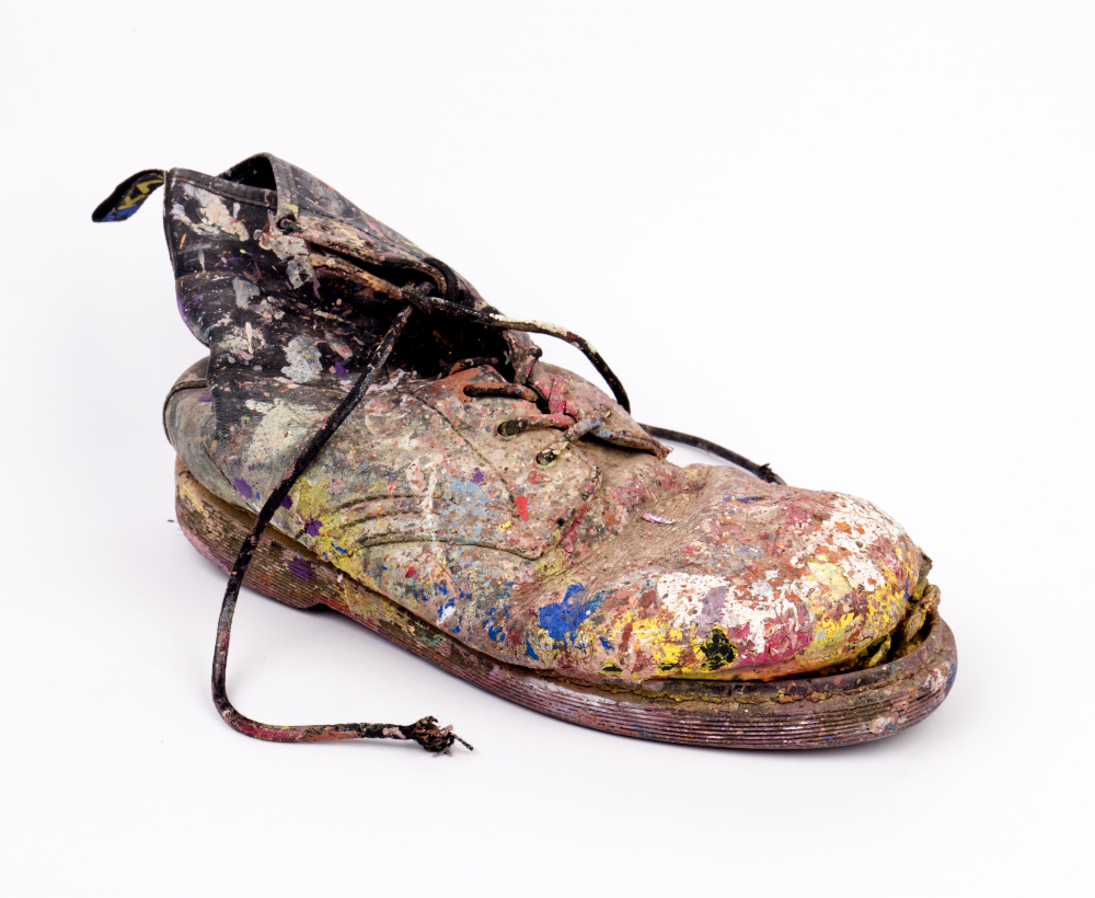 Bota utilizada para pintar. Presenta desgastes, tiene la suela parcialmente desprendida y está cubierta de salpicaduras de pintura. Fecha: 2013-2017. Medidas: 340 x 140 x 135 mm. Materiales: cuero, goma, cordones, pintura acrílica y en spray. https://marcoprieto.com/