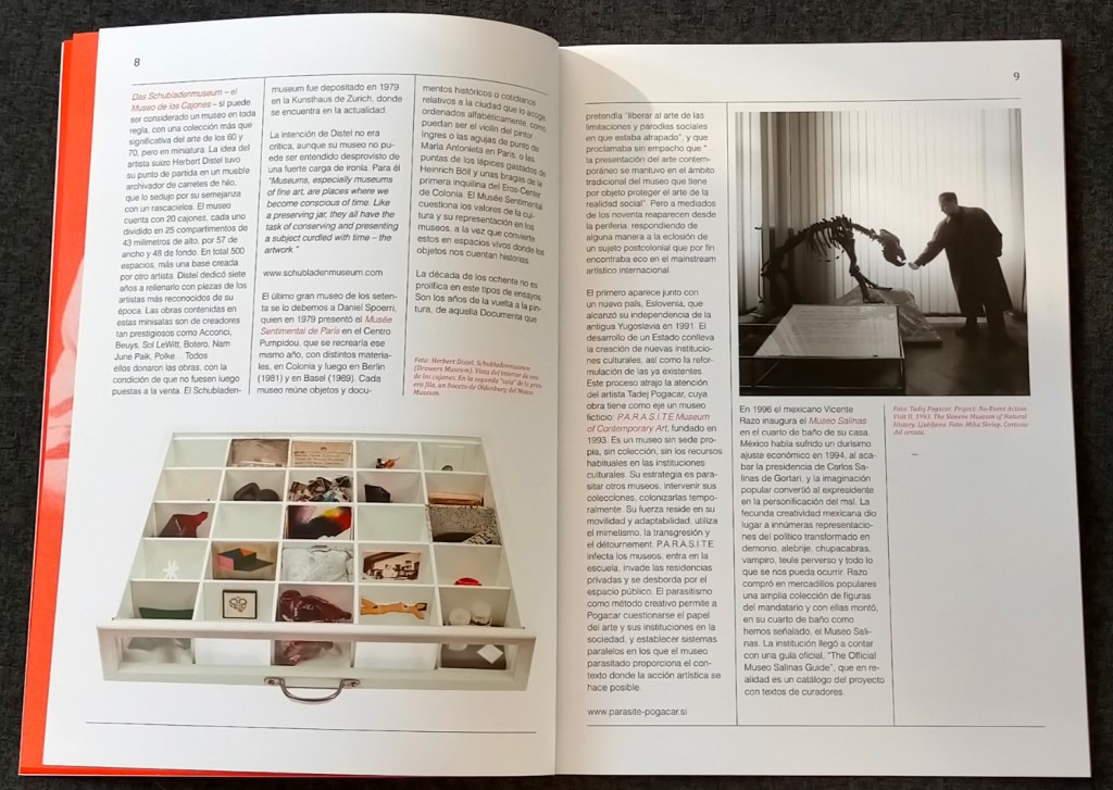 «In this essay, we have only included propositions that define themselves expressly and unequivocally as museums, and whose nature as such cannot be contradicted. Starting up a museum of contemporary art requires only the creative urge to do so and the will to make such a claim publicly, as happens when the artist or the curator let their vocations be known to the world. Many other creators have dealt with the museum, have adopted its space to display objects, have acted upon it, have argued with or about it, have even attacked it; nevertheless, here we are primarily interested in that which falls under the banner of institutional appropriation. These museums, covered above, anticipate what the cultural institution of the future should be like: formless, nomadic, transient, in constant dialogue with the area it occupies and generates. A museum which does not rely on grandiose and imposing buildings or the value of its collection, but which plays an active part in the comings and goings and tensions of metropolitan life.»