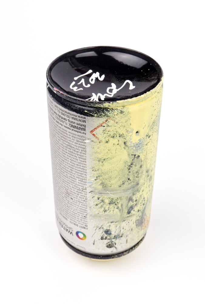 Bote de pintura en spray gastado. Fue utilizado para realizar graffitis en Madrid. Firmado y fechado en su base. A solicitud del artista, debe mostrarse boca abajo. Fecha: 2023 Medidas: Ø 66 mm. x 138 mm. Materiales: metal, plástico, pintura, papel. https://www.instagram.com/son3k_son3k_son3k/