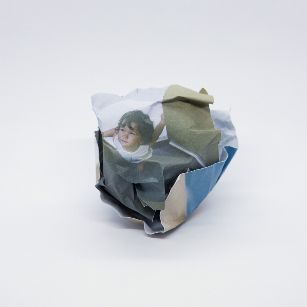 Bola formada con páginas desechadas de las pruebas de impresión del fotolibro Comes in waves.